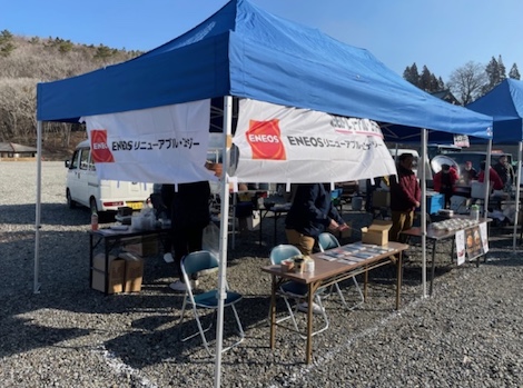 当社JRE大分別府湾風力発電所の近隣である西鹿鳴越(にしかなごえ)地区の「どんど焼き」*に、当社グループ社員が参加しました。地域の皆様から温かいお鍋やまゆ玉(木の枝に丸いお団子を刺して焼いたもの)をごちそういただき、社員たちにとって心温まるイベントでした。