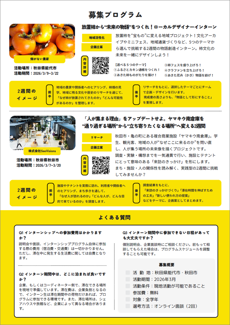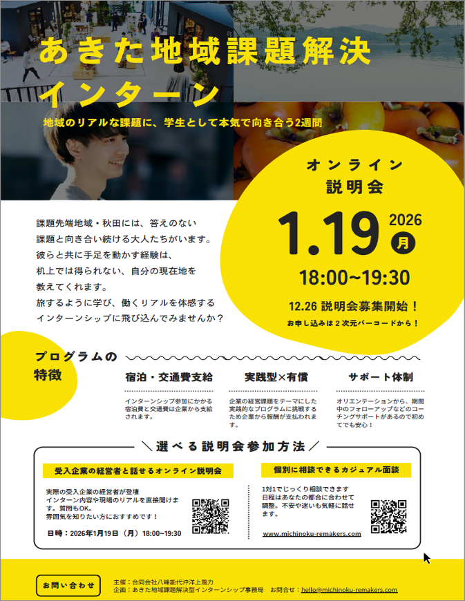当社が代表企業を務める合同会社八峰能代沖洋上風力では、地域貢献活動の一環として、秋田県を舞台にした「あきた地域課題解決インターン」を開催します。